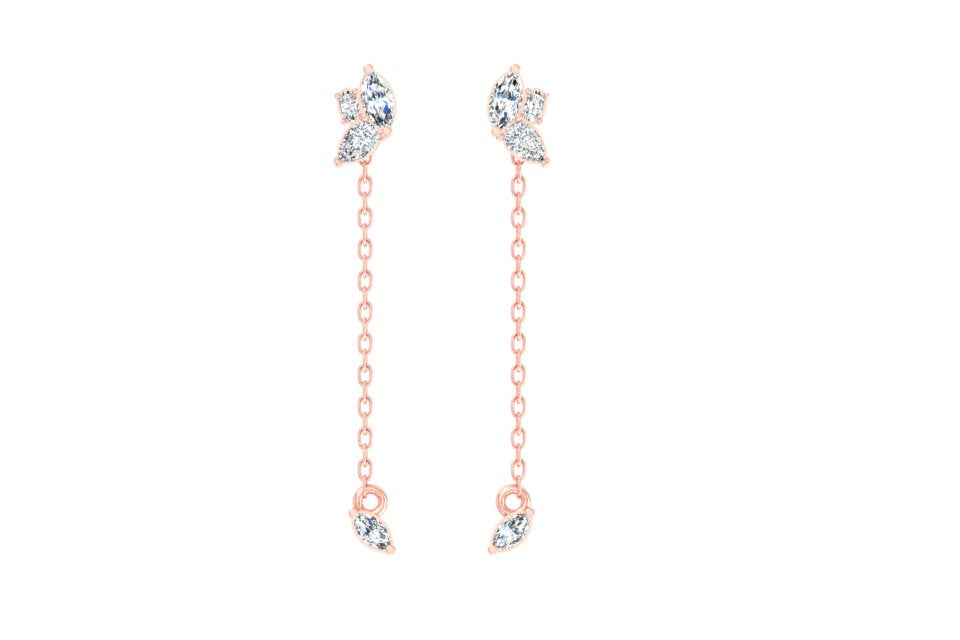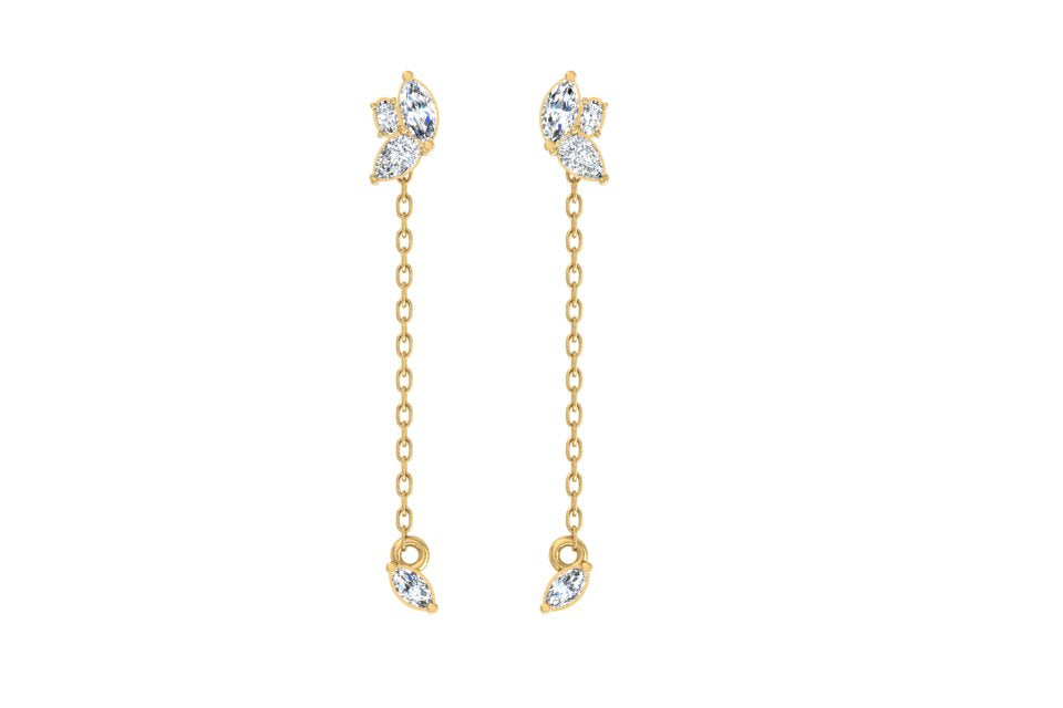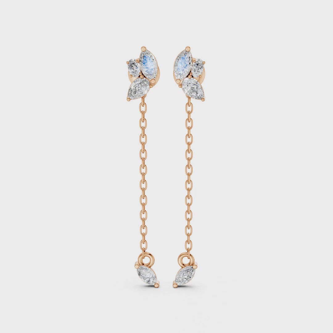 Meet the Marquise Drop Chain Earrings — a celebration of fluid beauty and refined craftsmanship. By Rosalía Jewels Designed for the modern romantic, each earring features a delicate cluster of lab-grown marquise, pear, and oval diamonds, catching the light with every gentle sway. Suspended from a fine drop chain, their silhouette evokes a sense of airy movement and effortless elegance. Now available in Premium Platinum and 14k or 18k gold—choose from white, yellow, or rose tones to match your mood or moment. With a total diamond weight of 1.02 CT and dimensions of 38.96 mm height by 6.7 mm width, these earrings bring contemporary floral charm and understated sparkle to your everyday or evening ensemble.